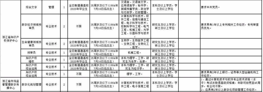 参与本次招聘的7家单位除浙江省知识产权保护中心为公益一类事业单位,经费形式为财政全额补助外,其他均为公益二类事业单位,经费形式为财政适当补助,7家单位办公地点都在杭州市区,机构规格均为正处级。本次招聘需求为22个岗位27人。部分岗位招聘对象范围为全日制普通高校2020年毕业生。