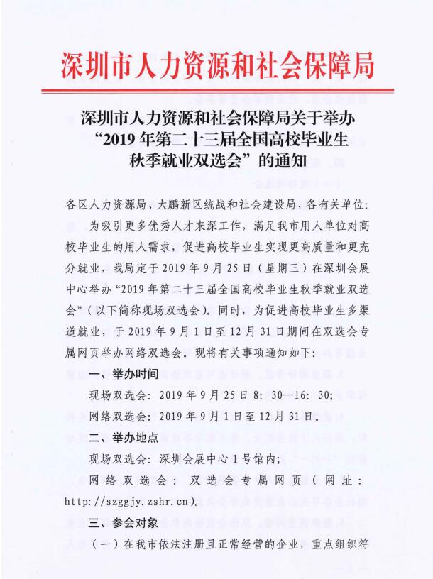 深圳市人力资源和社会保障局关于举办“2019年第二十三届全国高校毕业生秋季就业双选会”的通知