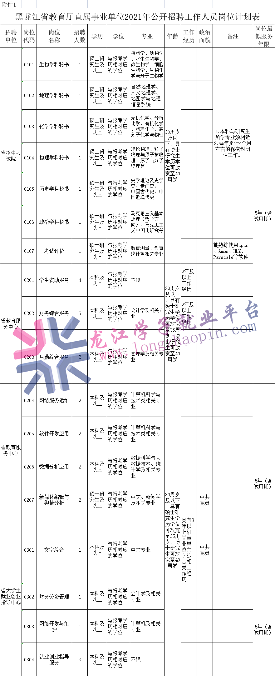 招聘工作人员32名。具体岗位详见《黑龙江省教育厅直属事业单位2021年公开招聘工作人员岗位计划表》(附件1)。