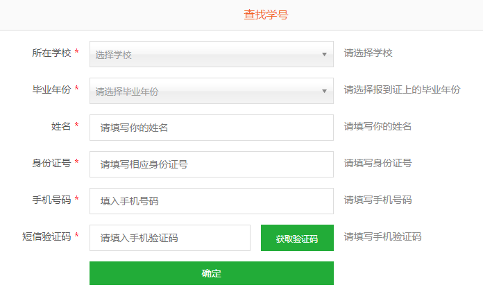 说明:如果在注册时忘记学号可以点击右侧【查找学号】,输入相应信息进行查找,如下图所示:
