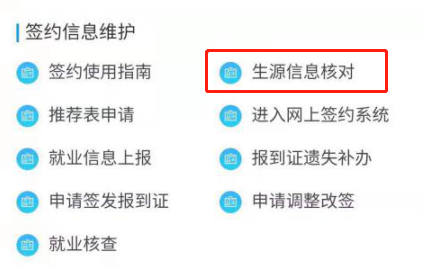 学生收到学校的生源核对通知后,在学校就业网门户、学生账号主页找到“生源核对”的板块并登录进系统,如下图所示: