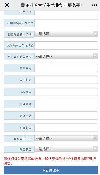 第三步,按要求仔细填写完善信息,点击页面最下方【保存并送审】,等待学校进行核对,如下图所示: