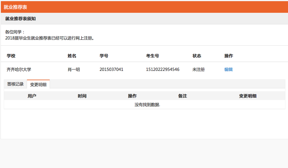 当看到状态是“未确认”时,学生即可完善生源信息并提交送审。点击右侧的【编辑】按钮进入详情。如下图所示: