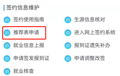 登录学校就业网首页找到“推荐表申请”模块,点击【推荐表申请】,如下图所示: