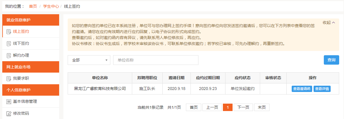 (1)学生能且只能与唯一一家用人单位签约,一旦签约后,其他邀请函只能查看,无法操作。