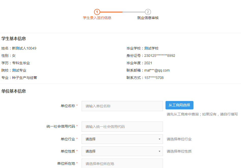 进入注册页面后,依次按要求填入信息,填入的信息要务必确保真实,提交后会自动和数据库信息进行比对,比对不通过请联系学校就业管理部门,比对通过后即注册成功。