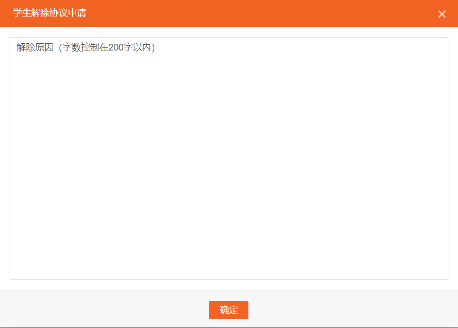 点击【解约申请】学生在弹出的解除协议申请中编辑解约原因,点击【确定】则解约申请形成并发送至用人单位处,等待用人单位处理,如下图所示: