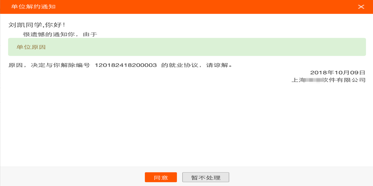 若单位向学生提出解约,仍然在该条目处进行操作,按钮名称会自动变成“查看解约”,此时学生点击【查看解约】后会出现用人单位发出的解约通知,如下图所示: