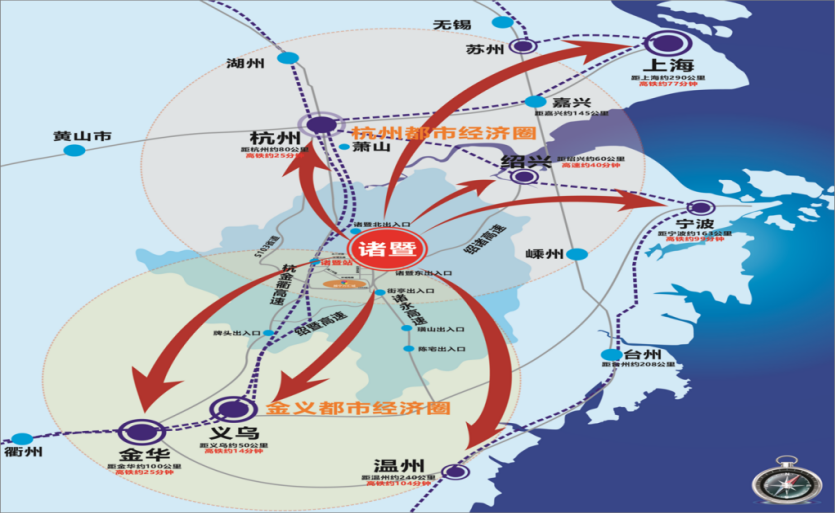 诸暨市位于浙江省中北部,市域面积2311平方公里,现辖23个镇乡(街道),户籍人口108万,常住人口约150万。诸暨市基本情况可以用“五个城”进行概括:诸暨是一座人文之城,是越国古都、西施故里,具有2000多年的建城史,先后涌现出王冕、杨维桢、陈洪绶等一批文坛奇才和俞秀松、张秋人等一批革命志士,孕育了14位两院院士和130多位将军。诸暨是一座融杭之城,东接绍兴,北邻杭州,南临义乌,是杭州都市圈紧密层核心城市,沪昆铁路、杭长高铁、杭金衢高速公路、诸永高速公路、绍诸高速公路贯穿全境,乘高铁至杭州只需23分钟。诸暨是一座活力之城,是中国袜业之都、中国珍珠之都、中国香榧之都、中国五金之乡,共有规上(限上)企业2326家、国家高新技术企业355家、省科技型中小企业1444家、境内外上市企业15家,拥有绍兴唯一的世界500强企业。诸暨是一座美丽之城,山川秀丽、名胜众多,拥有“浣江·五泄”国家4A级重点风景名胜区、西施故里旅游区、斯宅古民居建筑群、千年香榧林等旅游胜地。诸暨是一座和谐之城,是“枫桥经验”发源地,连续15年被评为省“平安县市”,捧得全省首批一星“平安金鼎”,是全国文明城市、全国新时代文明实践中心建设“先行试验区”。