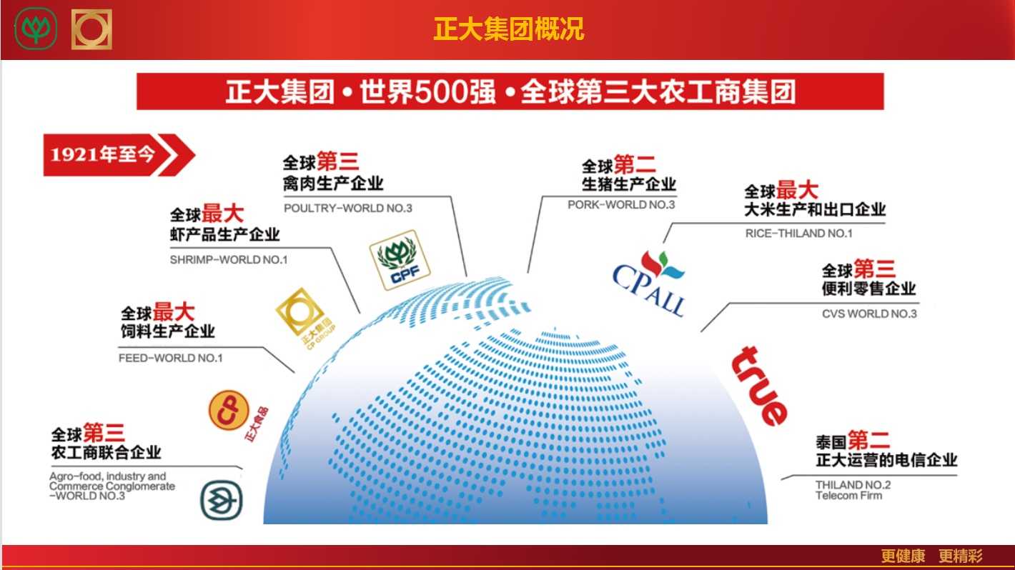 正大集团秉承“利国、利民、利企业”的经营宗旨,历经百年的蓬勃发展,已从经营单一业务的“正大庄种子行”,发展成以农牧食品、批发零售、电信电视三大事业为核心,同时涉足金融、地产、制药、机械加工等10多个行业和领域的多元化跨国集团公司。集团业务遍及全球100多个国家和地区,员工45万人,2021年全球销售额840亿美元。