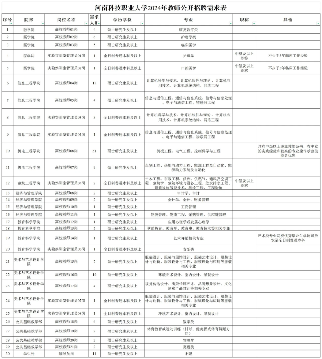 根据河南科技职业大学人才需求实际,现公开招聘教师141人,特公告如下。
