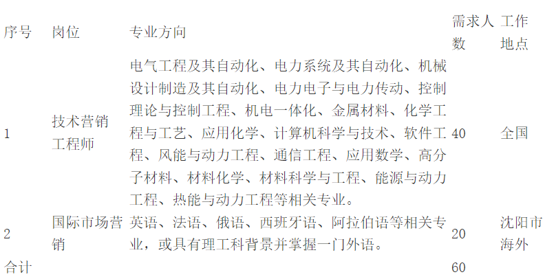 二、招聘条件 1.硕士研究生,本科毕业生,优秀海外留学生; 2.品行良好,性格开朗,有良好的沟通表达能力,可以接受出差; 3.在校期间担任学生干部、获奖学金者优先考虑; 4.国际市场类岗位需具备相应语言证书; 5.2022届、2023届、2024届毕业生均可投递。 三、薪酬福利 1.公司提供同行业75分位薪酬,入职即为员工缴纳六险一金,每年底结合公司效益享有高额营销奖金。 2.提供入职培训,住宿条件(或出差报销)、餐补、话补、免费通勤班车、节日福利、生日福利、探亲假、免费体检等。 3.员工可申请享受沈阳市就业人才政策,本科生600元/年,硕士研究生1200元/年。 四、简历投递渠道 渠道一: 将个人中文简历直接投递至公司校园招聘邮箱:shenbianzhaopin@tbea.com。 渠道二: 在电脑端输入特变电工校园招聘网申地址“tbea.hotjob.cn”,找到“沈变公司”按钮,点击并投递简历。 渠道三: “智联校园”官方网站或微信小程序搜索“特变电工沈阳变压器集团有限公司”查看具体岗位介绍并投递简历。 五、招聘流程 1.网申,筛选简历-测评-初试-复试-offer发放-签订就业协议; 2.邮箱投递简历命名方式为“2024校招-姓名-学校-专业-意向岗位”; 3.咨询电话 冯经理:13080723556 马经理:18525006099 陈经理:18240290226 徐经理:18940035237 4.沈变公司地址:辽宁省沈阳市经济技术开发区开发大路32号东北输变电科技产业园