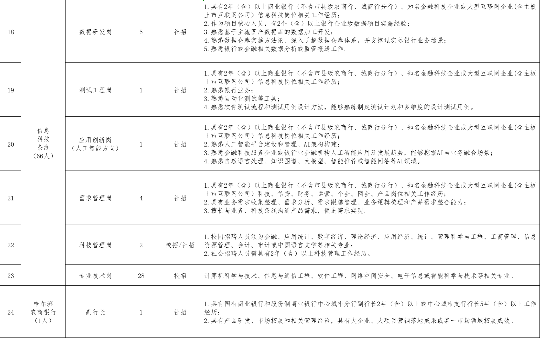 省联社本次招聘岗位24个,招聘人员97人。其中,同时面向高校和社会招聘15人,单独面向高校招聘28人,单独面向社会招聘54人(含哈尔滨农商银行副行长岗位1人)。