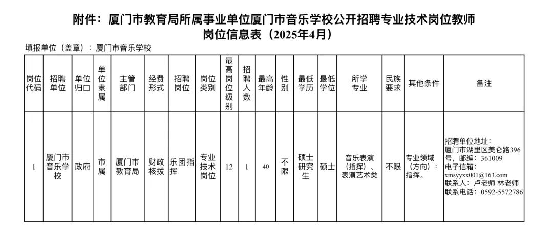 厦门市音乐学校公开招聘专业技术岗位教师简章