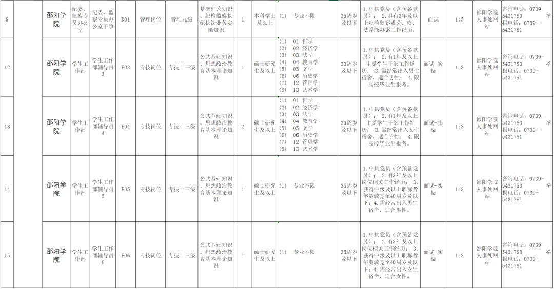 邵阳学院创建于1958年,医学类专业办学可追溯到1906年,2002年由原邵阳师范高等专科学校和原邵阳高等专科学校合并升本,2016年邵阳医学高等专科学校并入。学校是经教育部批准的具有“服务国家特殊需求人才培养项目”硕士专业学位研究生和留学生招生资格的省属全日制普通本科院校,2018年被确定为湖南省高水平应用特色学院。学校占地面积166.44万平方米,有22个教学学院,6个湖南省应用特色学科,53个本科专业,涵盖经济学、法学、教育学、文学、历史学、理学、工学、农学、医学、管理学、艺术学11大学科门类。根据《事业单位人事管理条例》(中华人民共和国国务院令第652号)、《事业单位公开招聘人员暂行规定》(人事部令第6号)、《关于进一步做好事业单位公开招聘工作的通知》(人社部发〔2024〕57号)和我省事业单位公开招聘有关政策,结合我校工作需要,面向社会公开招聘事业单位工作人员。现将具体招聘方案公告如下: 组织领导:在湖南省人力资源和社会保障厅指导监督下,学校成立公开招聘工作领导小组,领导小组办公室设学校人事处,具体负责招聘工作的组织、实施、协调等事宜。学校纪检部门全程参与监督。 招聘原则 (一)坚持德才兼备、以德为先的用人标准; (二)坚持公开、平等、竞争、择优的原则; (三)坚持工作需要、人岗相适,注重综合能力和专业知识相结合。 招聘条件 (一)具有中华人民共和国国籍; (二)遵守中华人民共和国宪法和法律,拥护中国共产党领导和社会主义制度; (三)具有良好的品行和职业道德; (四)具有岗位所需的专业或技能条件,岗位所要求的专业以教育部学科专业目录为准; (五)适应岗位要求的身体条件及其他条件。 有下列情形之一的人员,不得报名: 1.现役军人; 2.在读高校非2025届毕业生(指2026年及以后毕业的毕业生); 3.曾因犯罪受过刑事处罚的人员; 4.曾被开除中国共产党党籍、被开除公职的人员; 5.尚未解除党纪、政务、事业单位工作人员处分或者正在接受纪律审查和监察调查的人员; 6.涉嫌违法犯罪正在接受司法调查尚未作出结论的人员; 7.在各级各类事业单位公开招聘中因违反《事业单位公开招聘违纪违规行为处理规定》被记入事业单位公开招聘应聘人员诚信档案库,且在记录期限内的人员; 8.按照《事业单位公开招聘人员暂行规定》、《事业单位人事管理回避规定》等应当执行回避制度的人员; 9.法律、政策规定不得聘用为事业单位工作人员的其他情形的人员。 招聘岗位、计划及要求 此次招聘岗位15个,招聘计划22名,其中管理岗位招聘计划1名,专业技术岗位招聘计划21名(详见附件1)。 招聘程序 (一)发布信息 招聘信息通过湖南省人力资源和社会保障厅 (http://rst.hunan.gov.cn/) 与邵阳学院网站面向社会公开发布。 (二)报名 1.报名时间 2025年5月12日至2025年5月19日。 2.报名方式 采取邮箱报名的方式,每人限报一个岗位,多报则取消应聘资格。 请应聘人员将报名材料原件扫描或拍照,以压缩包(命名为“岗位代码+岗位名称+姓名”)形式发送至报名专用邮箱 syxygkzp@163.com,并与招聘单位确认是否收到邮件。 3.报名材料 (1)请应聘人员自行下载并如实填写《湖南省事业单位公开招聘人员报名表》(附件2),须在承诺栏手写签名; (2)本人有效身份证(正反面)、学历学位证书原件(或学信网教育部学历证书电子注册备案表)和岗位要求的资格证书及相关材料原件,应届毕业生还须提供毕业生就业推荐表(需盖学校公章); (3)近期同底彩色免冠1寸照片1张; (4)招聘岗位要求政治面貌为中共党员(含预备党员)的,应聘人员须提供所在基层党组织开具的党员身份证明(加盖党组织公章,落款日期为2025年1月1日以后); (5)招聘岗位要求有主要学生干部工作经验的,由就读学校所在院系出具相关证明并加盖公章,出具相关证明材料(证明模板详见邵阳学院人事处网站文档下载栏),主要学生干部指校、院团委学生会或研究生会副部长及以上;校学生社团管理部主席、副主席;学生社团联合会主席、副主席;校、院学生自律委员会等主任、副主任;校易班学生工作站部长;校、院学生党支部(副)书记;班长、团支部书记; (6)招聘岗位明确要求有工作经历的,应聘人员须提供工作经历证明(加盖工作单位公章或人事部门公章); (7)招聘岗位对专业研究方向有要求的,须提供就读学校出具的专业证明材料(导师签字且毕业学院盖章); (8)现有工作单位的应聘人员须由所在单位或主管部门出具同意报考证明并加盖单位公章(可入围体检后提供)。 4.相关要求 应聘人员的学历(学位)必须为国家承认的学历(学位)。出国留学人员学历应通过教育部相关部门的学历认证。以上学历学位证书(学历认证)必须于2025年7月31日前取得。未在规定期限内取得,则取消应聘资格。 在全日制学校就读期间参加社会实践、实习、兼职等不能视为工作经历。工作经历年限按足年足月累计计算,以2025年3月31日为截止日期。 本次招聘所设专业不区分专业硕士、博士和学术硕士、博士。 (三)资格审查 根据岗位招聘要求对应聘人员报名条件进行资格审查。资格审查分为初审和复审,且资格审查贯穿招聘工作全过程,任何环节发现应聘人员不符合岗位报名条件或提供的材料弄虚作假,一经查实,取消考试或聘用资格。 1.初审:根据岗位招聘要求对应聘人员报名条件进行资格初审。通过资格初审