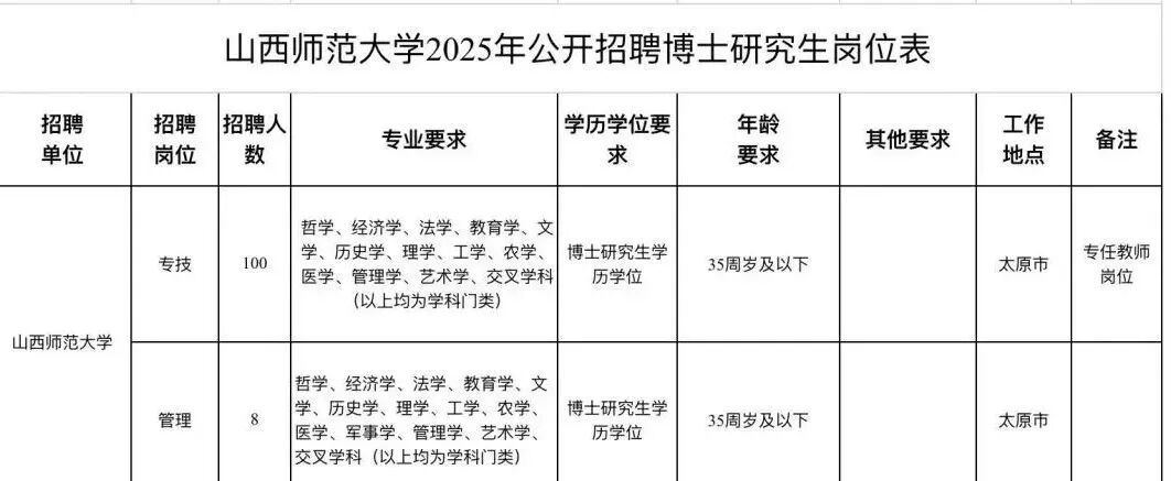 山西师范大学2025年公开招聘博士研究生108名,其中专业技术岗位100名,管理岗位8名。招聘岗位所需的具体条件以《山西师范大学2025年公开招聘博士研究生岗位表》(附件1)的要求为准。