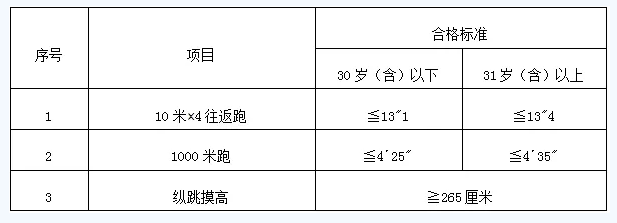3.体能测评:根据招聘同一岗位考试总成绩从高到低的顺序,按照进入体能测评人数与招聘岗位计划人数2:1的比例确定体能测评人数,如有自愿放弃体能测评或不按规定时间、地点参加体能测评的考生,视为自动放弃体能测试资格。