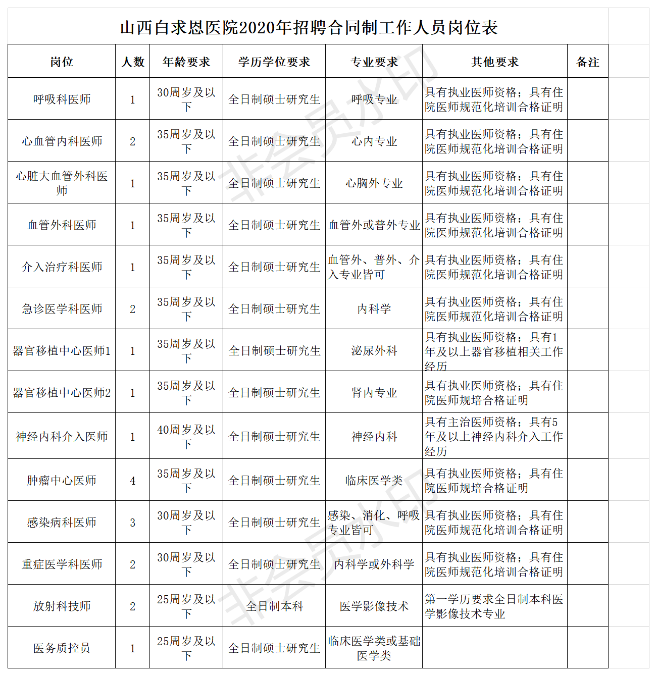 山西白求恩医院2020年招聘合同制工作人员23名,招聘岗位所需的具体条件以附件1《山西白求恩医院2020年招聘合同制工作人员岗位表》(以下简称《岗位表》)的要求为准。
