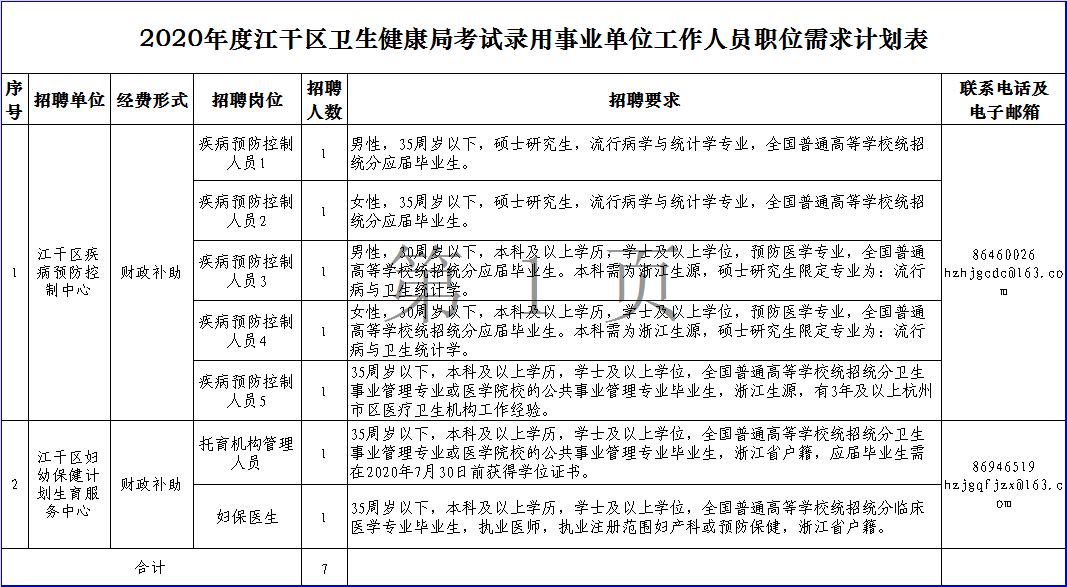 【浙江省】2020年杭州市江干区卫生健康局招聘公共卫生事业单位人员公告