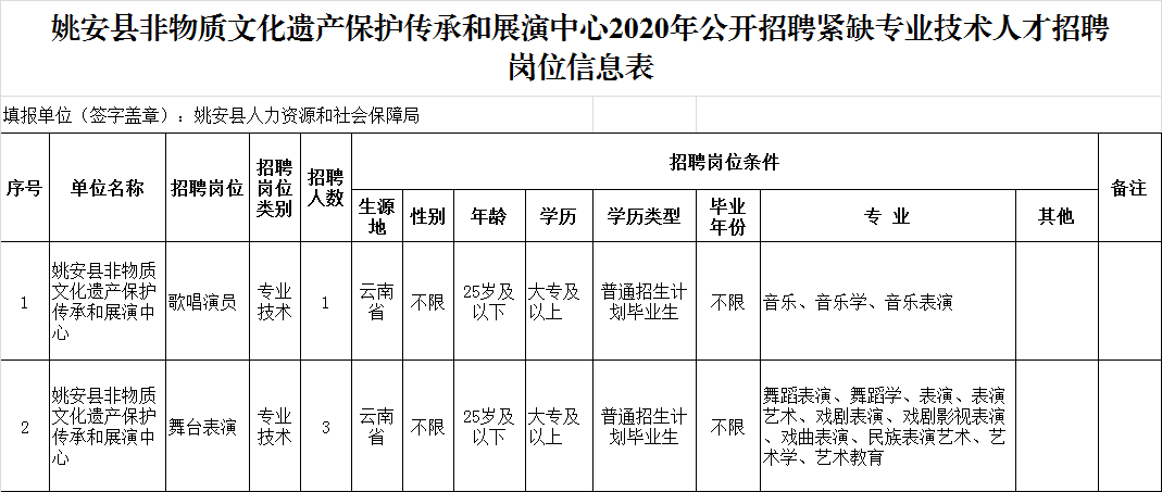 【云南省】2020年楚雄州姚安县非物质文化遗产保护传承和展演中心招聘紧缺人才公告