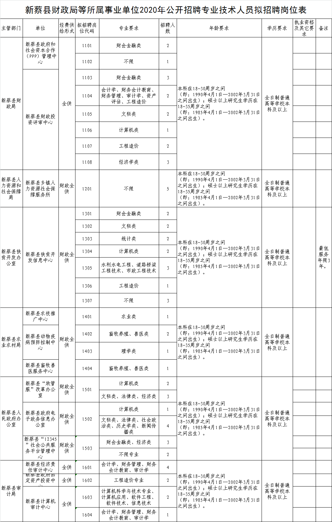 【河南省】2020年驻马店市新蔡县财政局等所属事业单位招聘专业技术人员公告