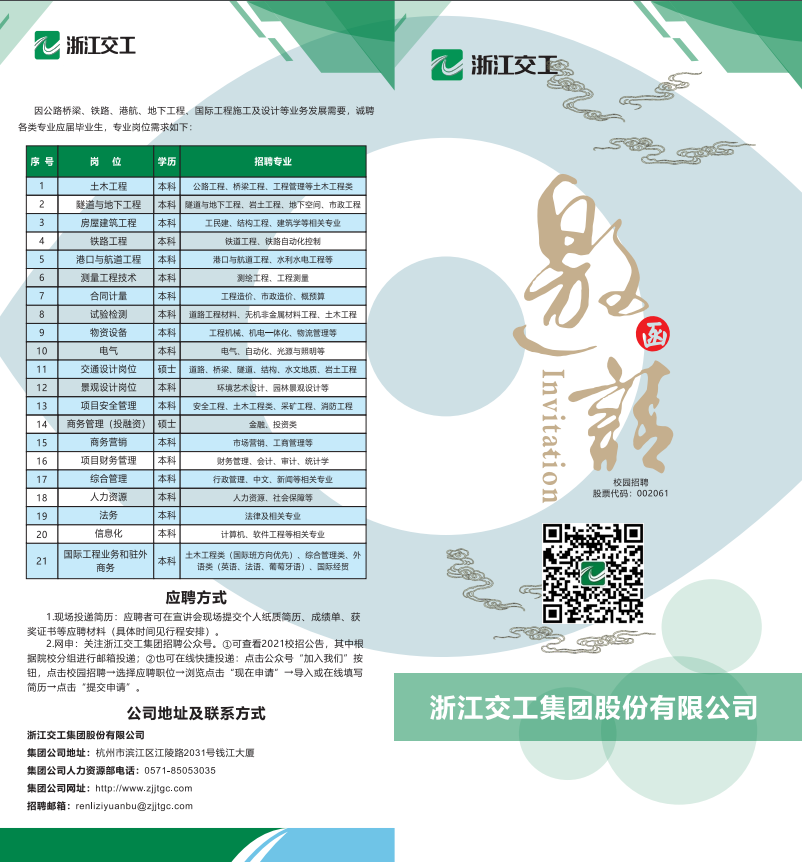 专场招聘会【土木、建筑、机械、电气、自动化、计算机、环境、园林、会计、行政管理】浙江交工集团股份有限公司