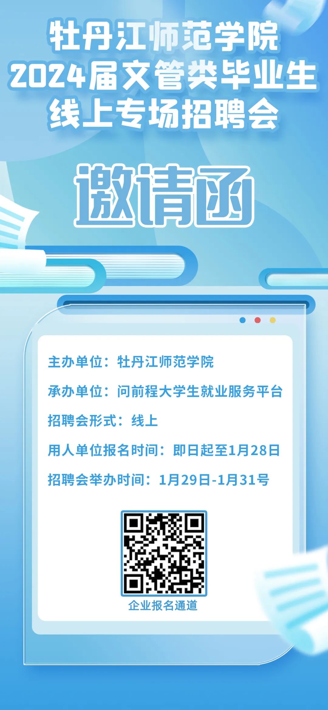 为做好我校2024届毕业生就业工作,持续为毕业生与用人单位之间搭建供需沟通桥梁;我校联合问前程大学生就业服务平台,拟于2024年1月29日举办“牡丹江师范学院2024届文管类毕业生线上专场招聘会”,现诚邀贵单位报名参会,招聘英才。
