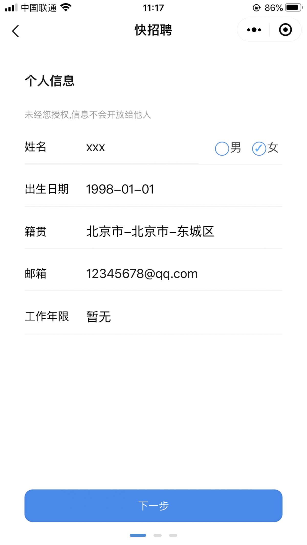 点击进入个人中心扫码进入小程序后,选择使用当前微信手机号进行登录。登录完成后点击下方栏目“我的”,完善基本信息与个人简历(简历须完善至70%以上方可查看详细双选会信息)以便进行后续应聘工作。