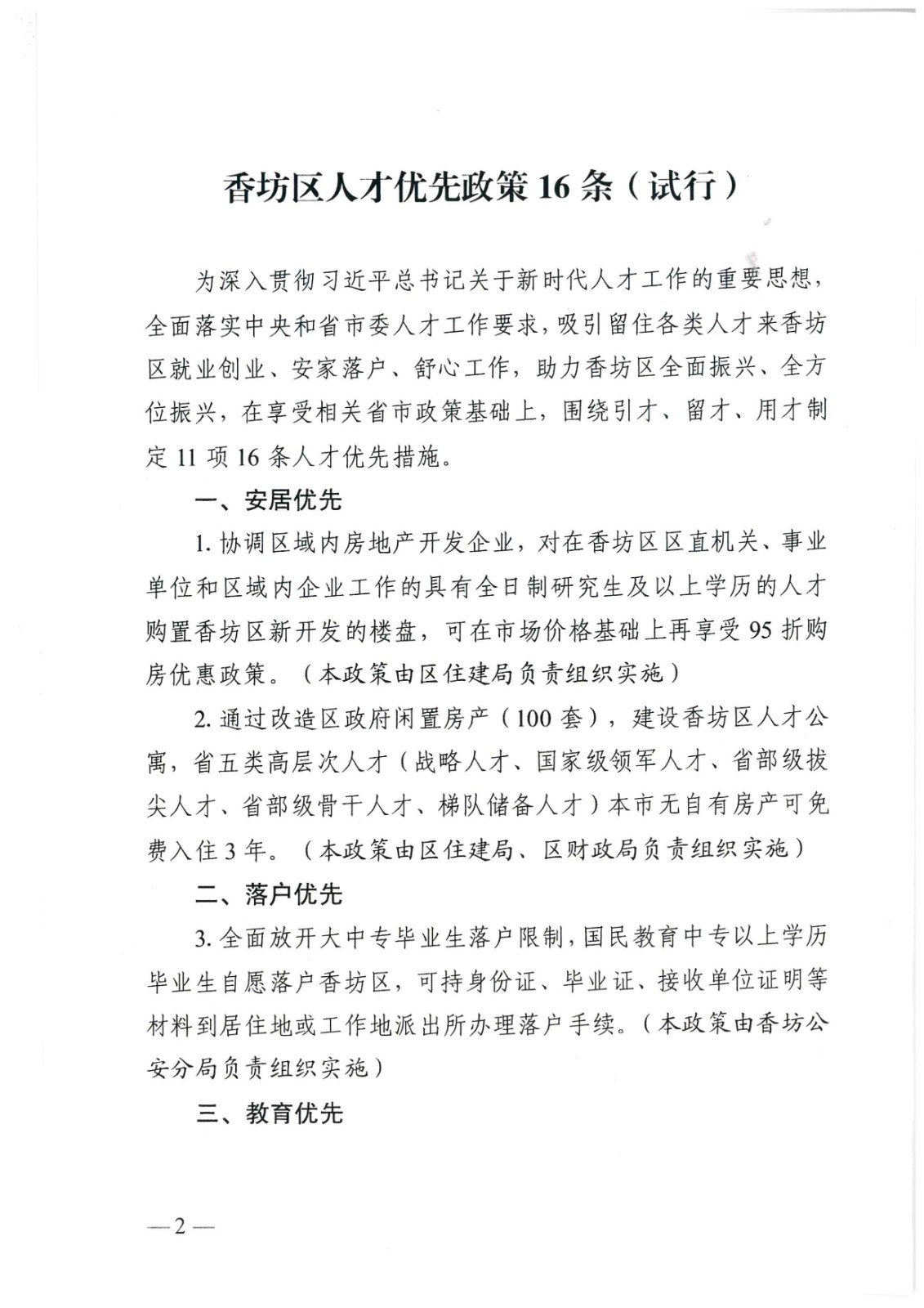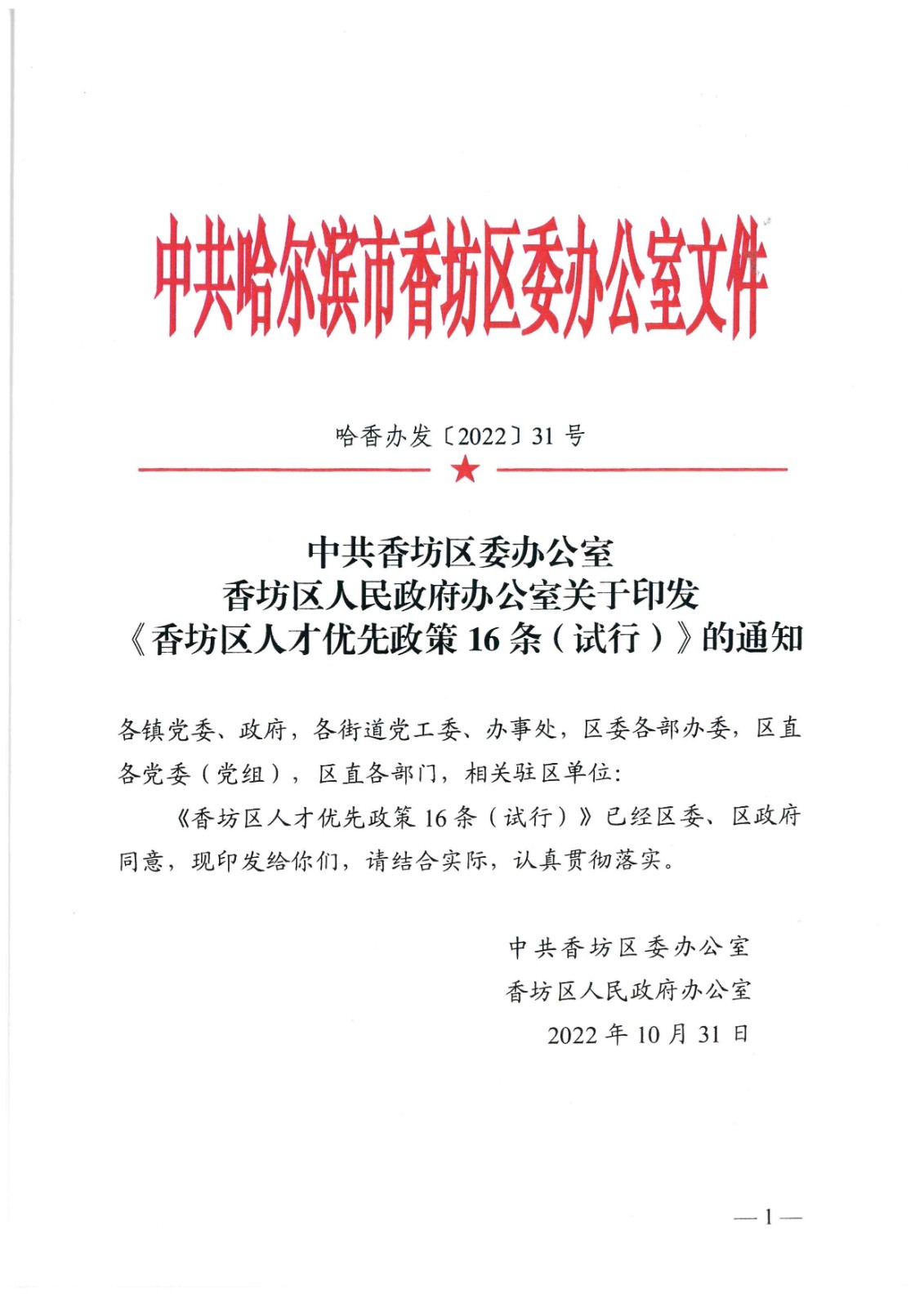 中共香坊区委办公室香坊区人民政府办公室关于印发《香坊区人才优先政策第16条(试行)》的通知