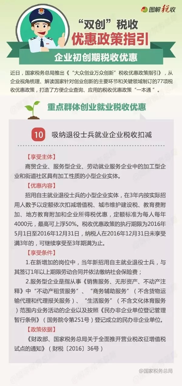 近日,国家税务总局推出《“大众创业万众创新”税收优惠政策指引》,从企业视角梳理、解读国家针对创业创新的主要环节和关键领域制订的77项税收优惠政策,打造了方便企业查询、应用的税收优惠政策“一本通 ”。我们将陆续编发77项税收优惠政策的具体内容。今天发布企业初创期税收优惠之小微企业税收优惠政策:退役士兵创业税收扣减,吸纳退役士兵就业企业税收扣减。