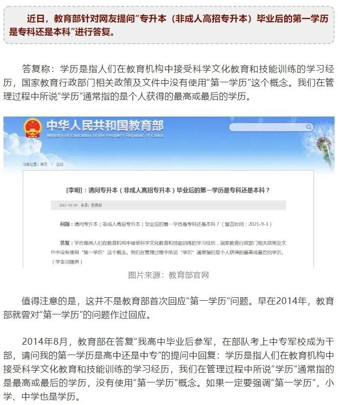 这个问题已经存在多年,从报考专科学校的考生咨询开始,到每一年专升本报名之时,再到毕业求职应聘之际,总会有不绝于耳的声音问着同样的问题:专升本是“第一学历”吗?小编感觉这个问题仿佛已经被盘的都包浆了!小编认为,想要回答这个问题我们不妨从政策和应用两个层面入手。从政策层面看,“第一学历”是个伪命题!
