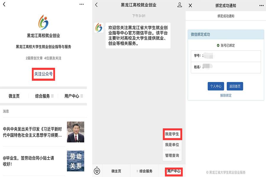 学生用个人微信扫描系统页面给出的二维码,点击关注“黑龙江高校就业创业”微信公众号,即可完成学生用户微信端绑定。绑定状态校验:进入“黑龙江高校就业创业”微信公众号(可在网站首页扫描二维码关注微信公众号),在微信公众号下端点击用户中心-我是学生,输入账号和密码进行绑定,查看绑定状态,如下图所示:
