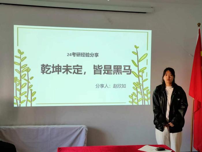 赵欣如同学通过PPT讲座的形式向备考学生分享的考研成果和择校经验,谈到选择院校需考虑到高校综合能力以及专业实力,但更重要的是要结合自身的实际。