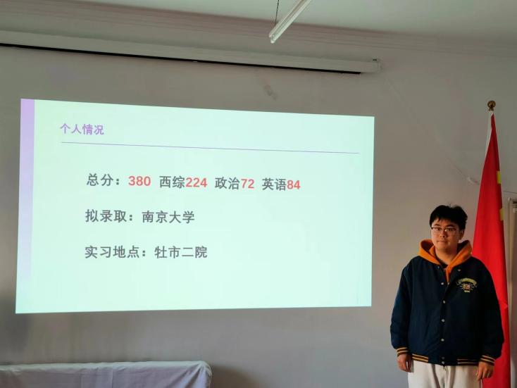 韩君明同学为我们进一步介绍英语,政治,西综的学习方法。 他表示考研是新的起点、新的征程,同学们需要以自信的姿态,以最饱满的热情和斗志,努力拼搏,奋勇向上,去取得新一轮的胜利,实现人生的跨越。