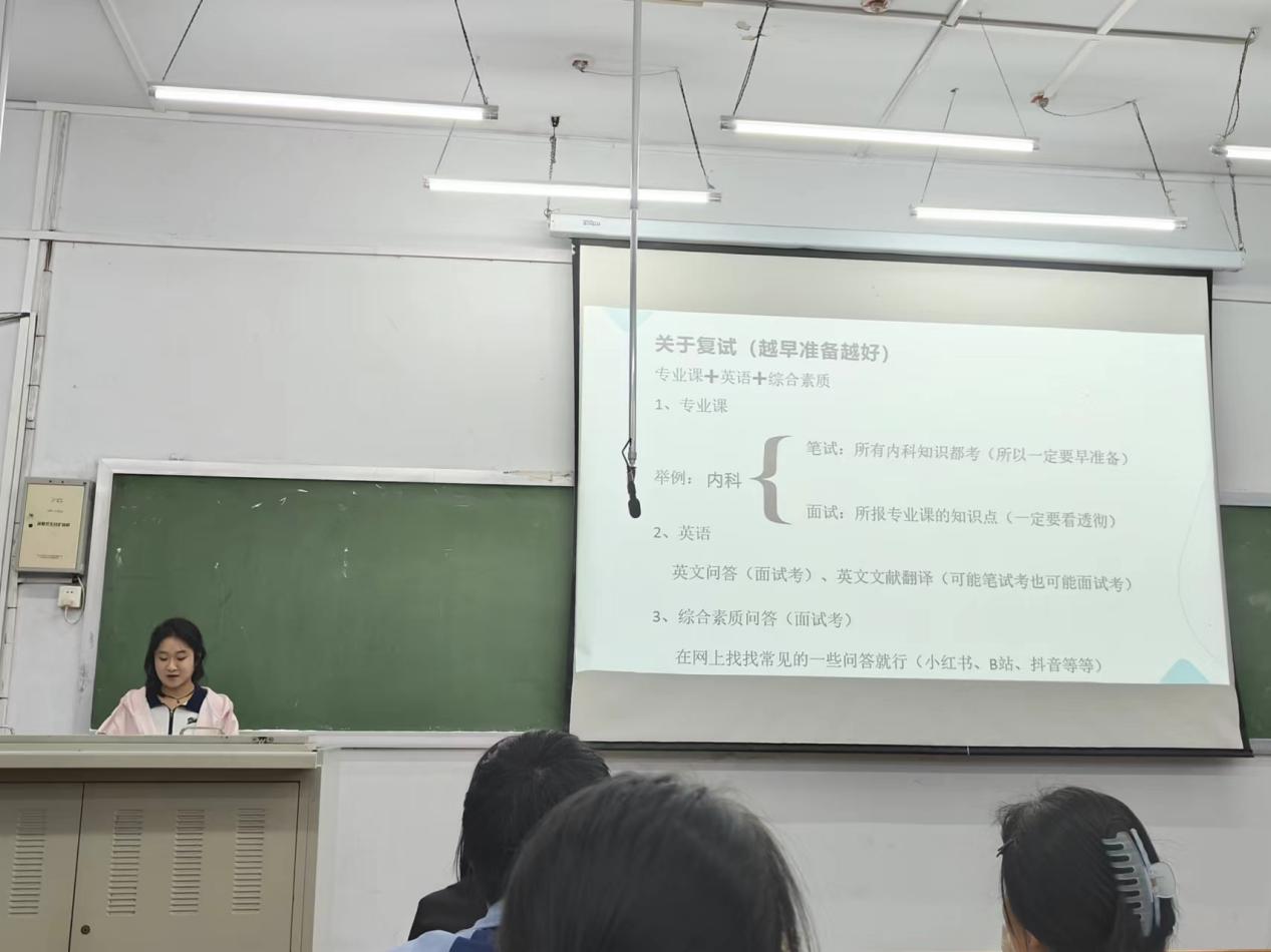 为进一步帮助考研学子把握考研形势、明确考研目标、掌握科学备考方法及学习规划,充分发挥优秀学子的示范领导作用,5月15日,第二临床医学院在外语南楼阶梯一教室召开考研经验分享交流会,邀请了被大连医科大学录取的姚心蕊、锦州医科大学录取的黄立雪进行经验分享,由实习就业科负责人孟庆贺主持,2021级在校生参加。