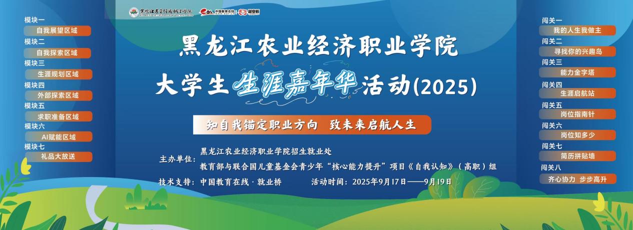 为深入贯彻落实国家关于职业教育 “强化就业导向” 的工作要求,切实提升职业院校学生职业生涯规划能力与就业核心竞争力,9月17日至19日,黑龙江农业经济职业学院2025年大学生生涯嘉年华活动在学院主楼南广场顺利举办。活动聚焦大一新生生涯教育需求,通过多元化实践形式搭建育人平台,为来自7个系的3600余名新生提供全方位生涯指导服务,此次活动是学院进一步推进 “三全育人”、优化就业服务体系的重要实践。