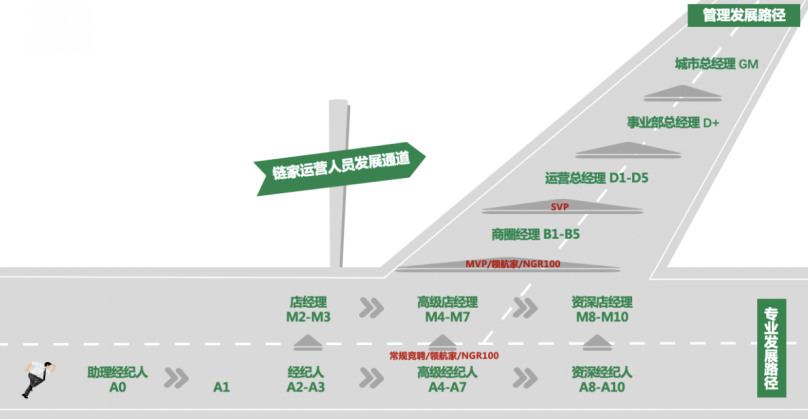 2、纵向晋升(管理层面):房产经纪人---店经理---商圈经理---区域总监---运营副总经理--总经理
